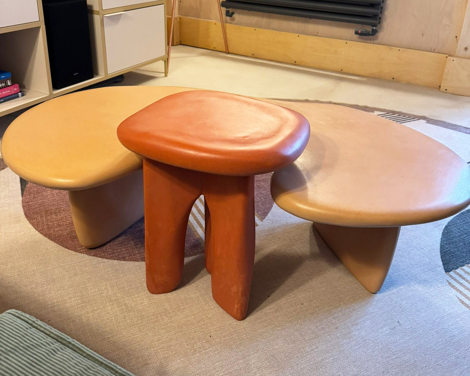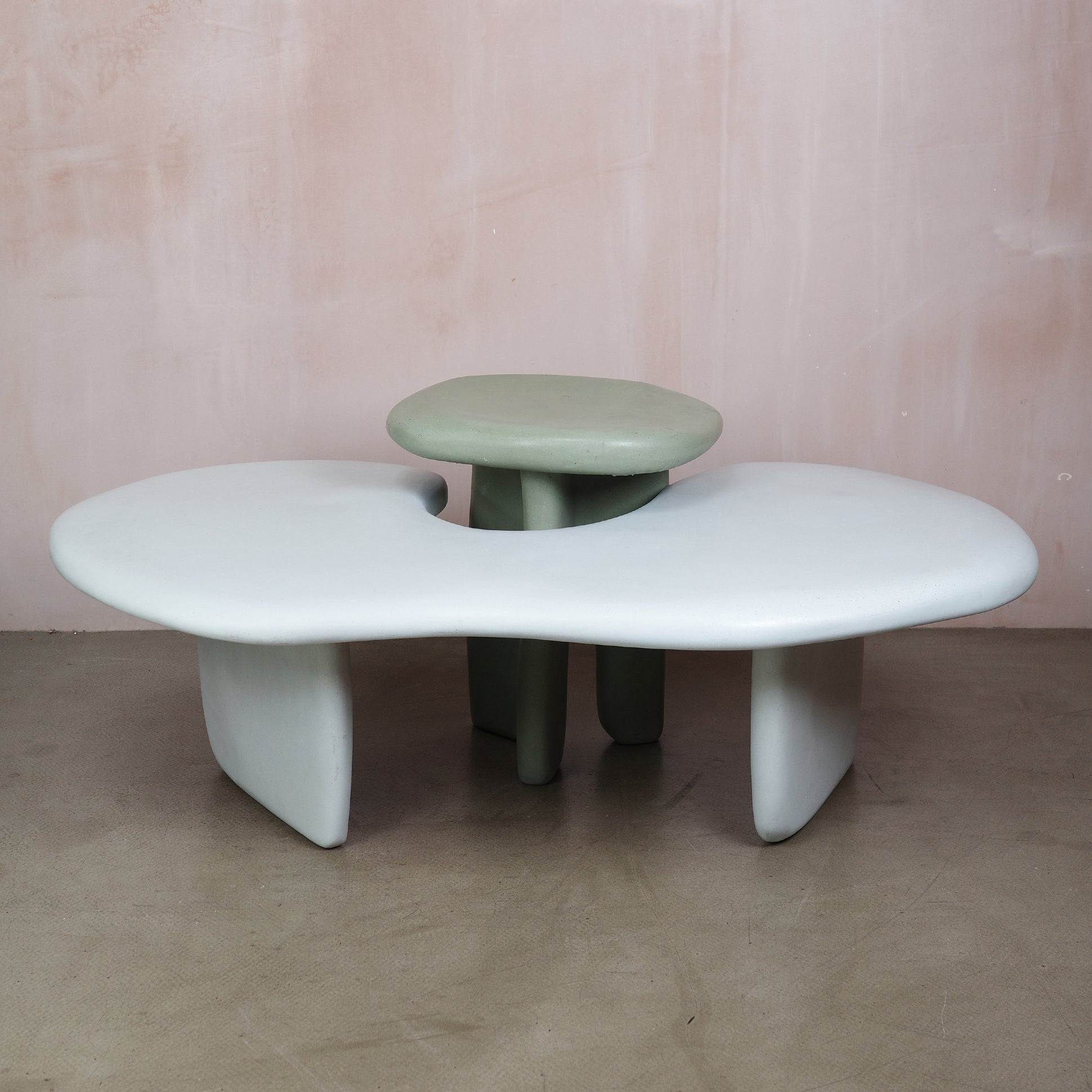 Tables shown in shade Powder and WKD. Stools shown are in shades Bricking It, Powder, Pickle, Charcoal & White and WKD.